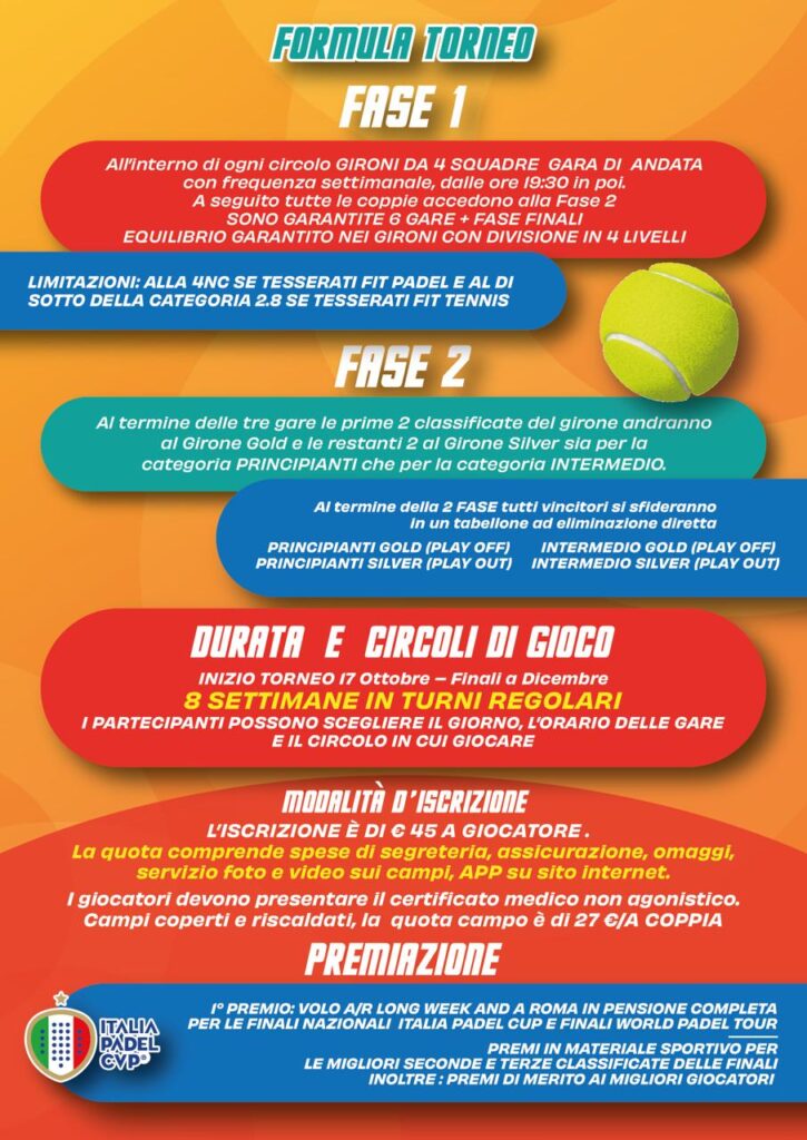 Sono garantite 6 partite più i Play Off. Al termine della manifestazione le migliori coppie dei gironi di ogni circolo si sfideranno in un tabellone ad eliminazione diretta con gli altri giorni, per decretare la migliore coppia di Milano e Provincia. La Milano Padel Cup fa a sua volta parte del Circuito Nazionale Italia Padel Cup. Le due coppie vincenti della Milano Padel Cup vanno a Roma per sfidarsi con le coppie vincenti delle altre realtà nazionali.